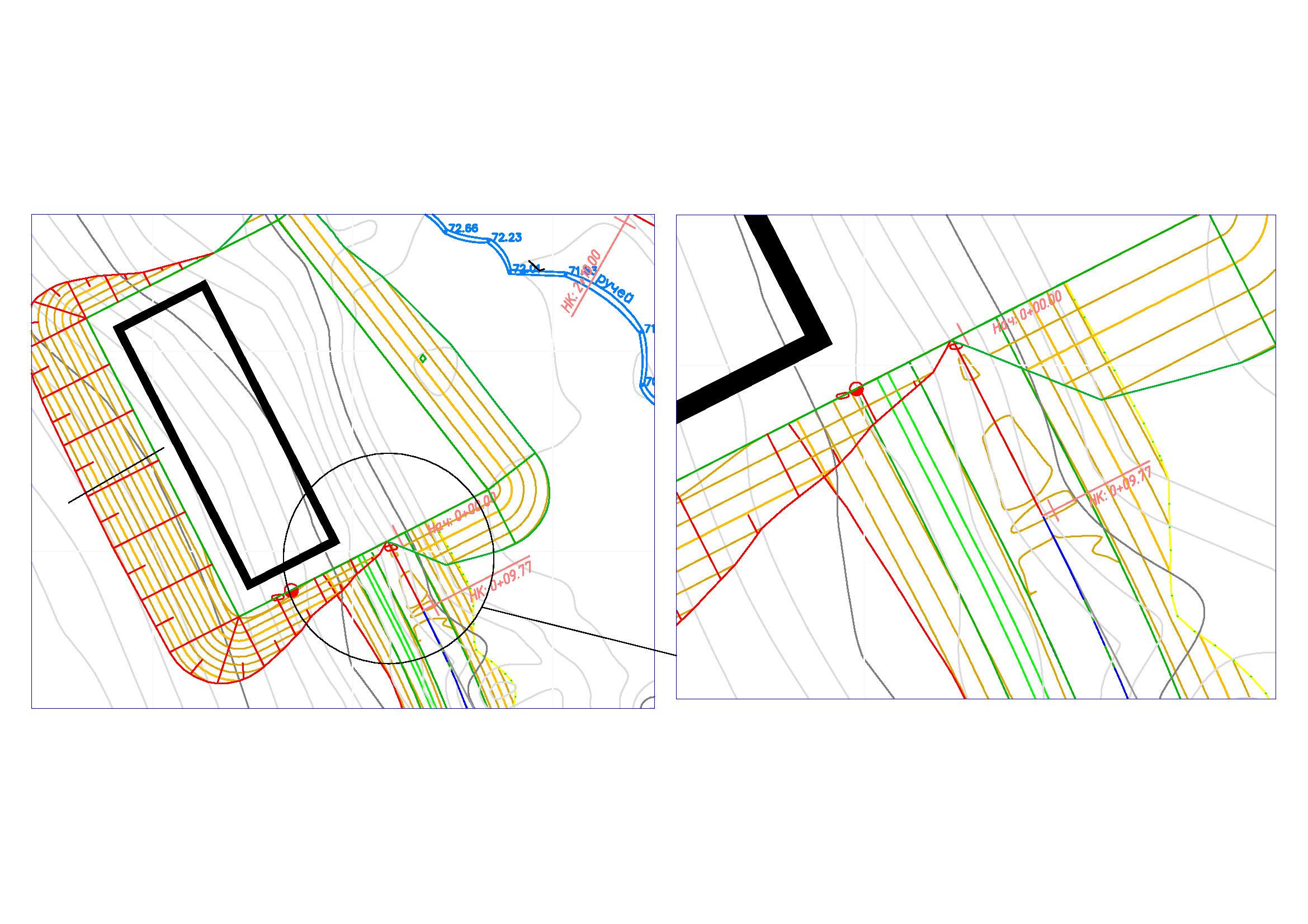 1) Построение площадки через профилирование таким образом чтоб обеспечить подъезд автодороги. Иными словами сопряжение автодороги с площадкой осуществляется строго под прямым углом к площадке. Профилирование контура в таком случае выполняется не на всю длину контура..